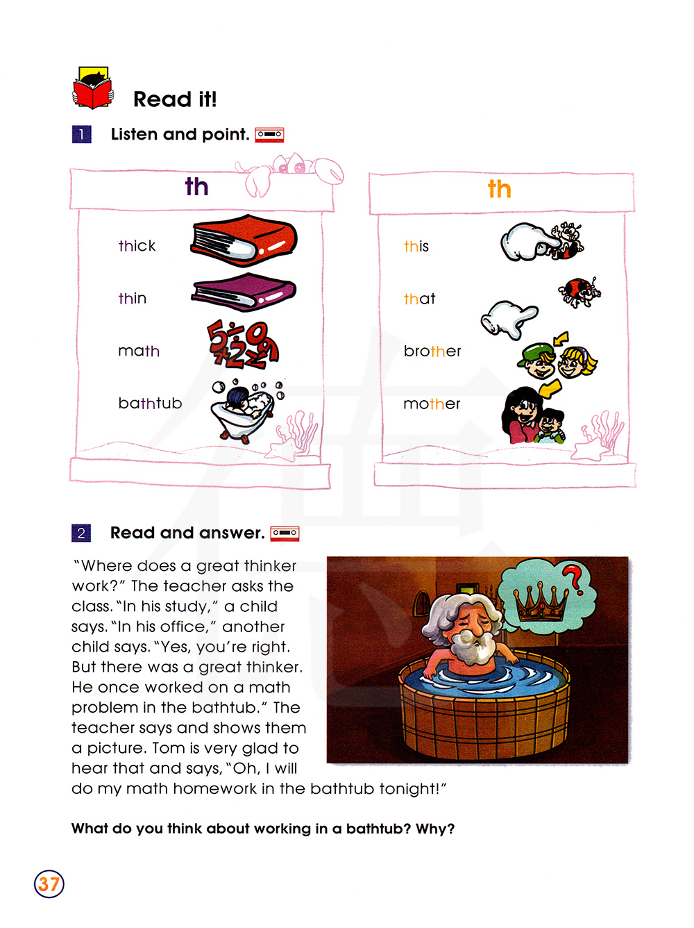 一个伟大的思想家在哪里工作?老师问全班同学。在他的书房里,一个孩子说。“在他的办公室里,”另一个孩子说。是的,你们说的都没错。但是从前有一位伟大的思想家。他有一次是在浴缸里解决了一个数学难题。老师边说边给他们看了一张照片。汤姆听了很高兴,并说到:哦,今晚我要在浴缸里做我的数学作业!