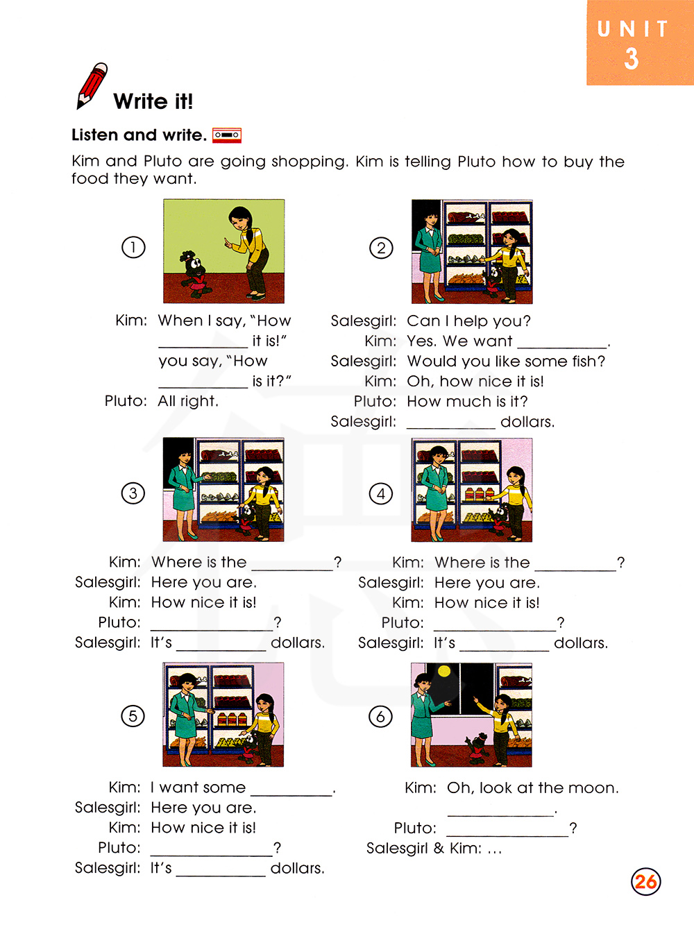 金和布鲁托准备去购物,金在告诉布鲁托如何买他们想要的食物。