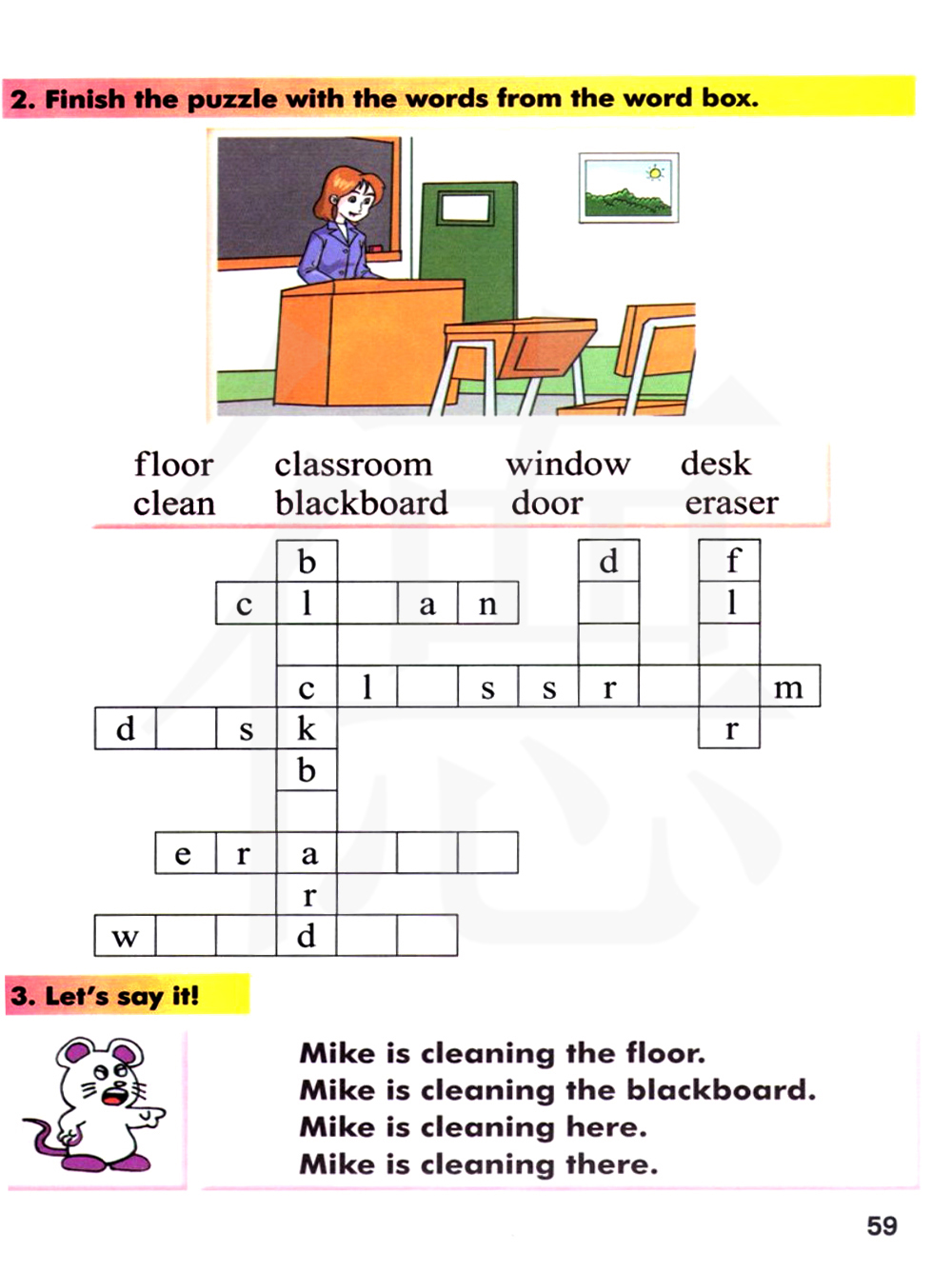 迈克正在扫地。迈克正在擦黑板