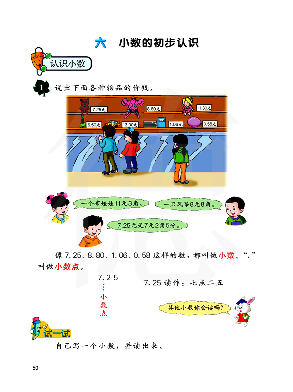 写法:先写整数部分,再在整数部分个位的右下角点小数点,最后一一写出小数部分。