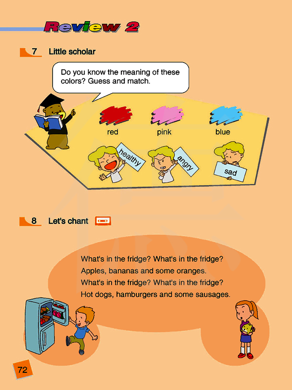 冰箱里有什么?冰箱里有什么?苹果,香蕉和一些橘子。冰箱里有什么?冰箱里有什么?热狗,汉堡包和一些火腿。
