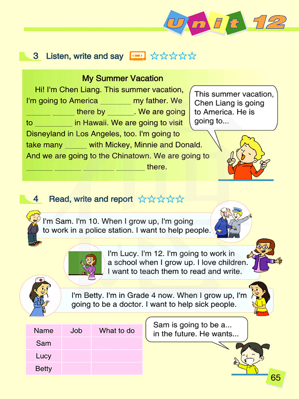 你好,我是陈良。这个暑假.我与我的父亲会去美国.我们将乘飞机去那里. 我们将要去夏威夷潜水。我们要去洛杉矶参观迪斯尼乐园。我要很多米奇图片。米妮和唐纳德。 我们要去唐人街。我们将要到那里去。