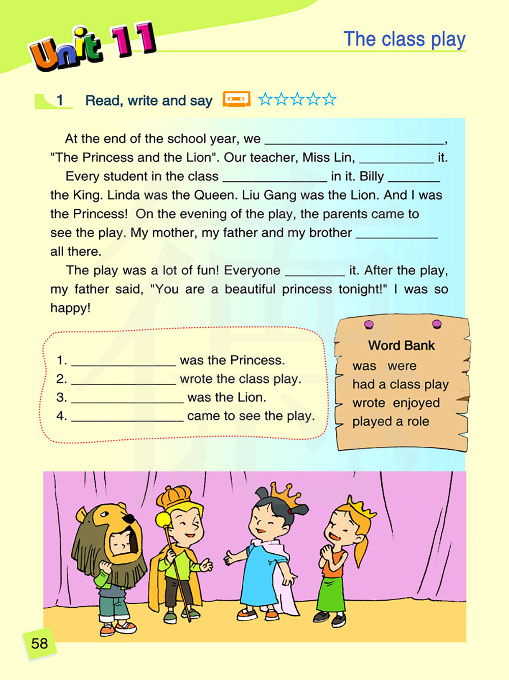 班上的每个学生都在扮演一个角色。 比利是国王。琳达是王后。刘刚是狮子。 我是公主! 在这个晚上。 爸爸妈妈来看表演。 我的爸爸妈妈和哥哥都在那里。
