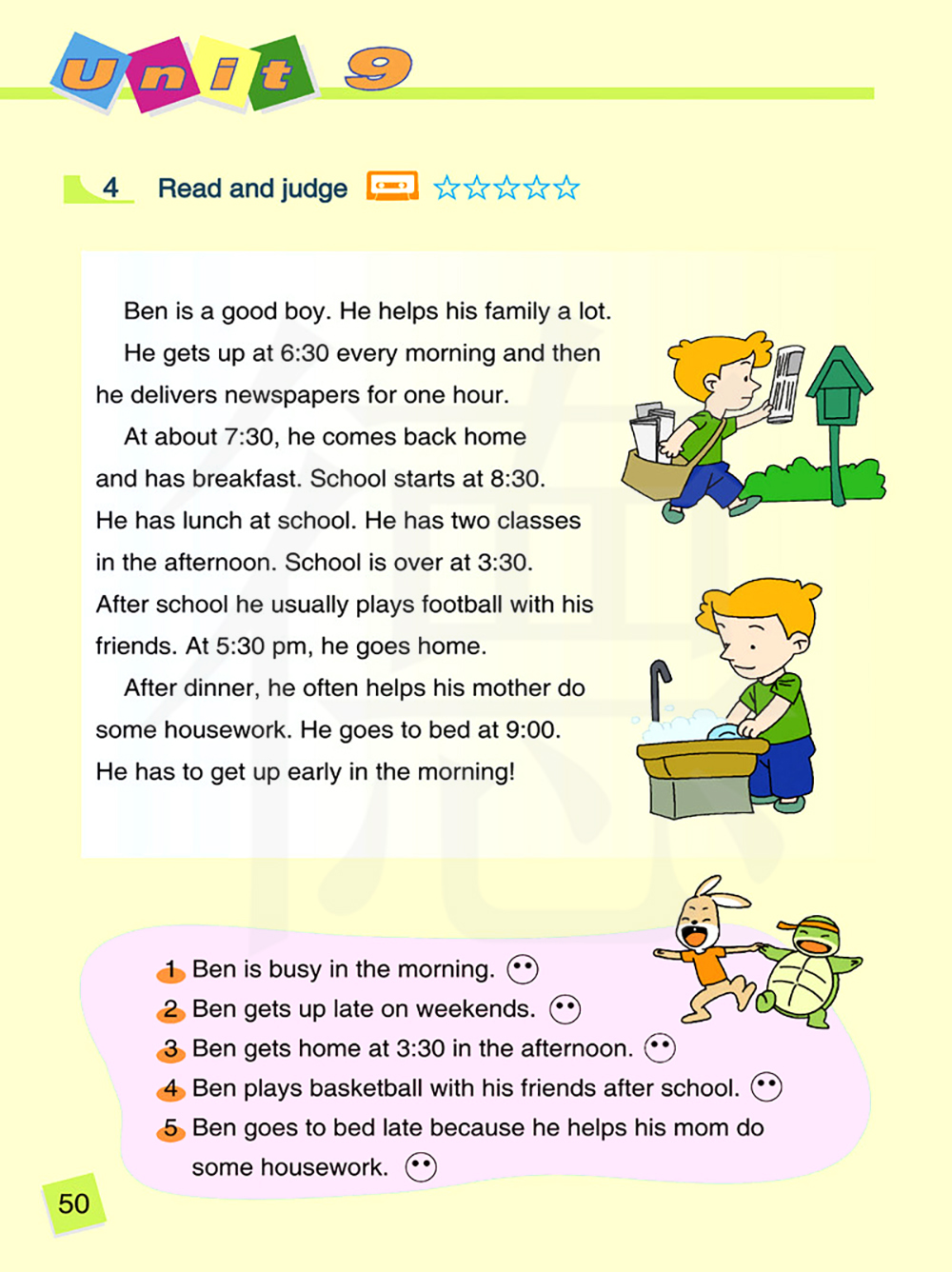 晚餐后,他经常帮助妈妈做家务。 他9点睡觉。他得早起。