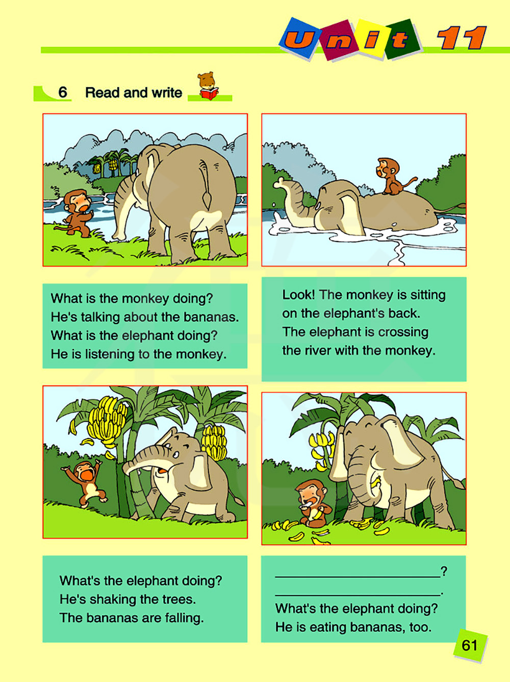 猴子正在做什么?他正在谈论香蕉。大象正在做什么?他正在听猴子说话。