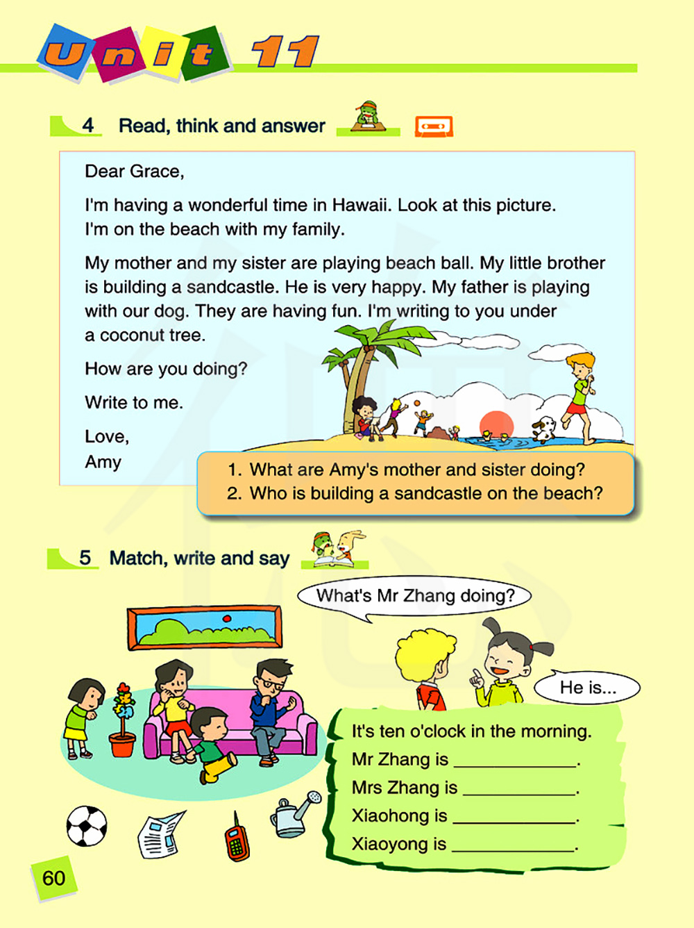 我的妈妈和妹妹在玩儿沙滩球。我的弟弟在搭沙堡。他很高兴。我的爸爸和我们的狗在玩儿。他们玩得很开心。我正在椰子树下给你写信。