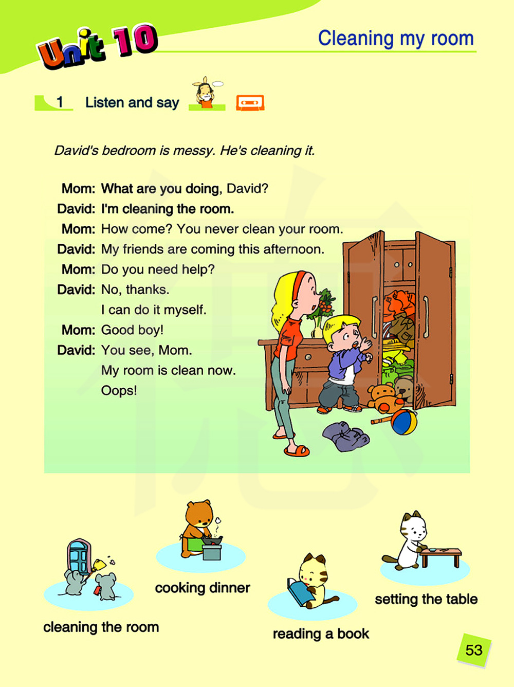 你在做什么,戴维?我在打扫房间。怎么了?你从来不收拾自己的房间。