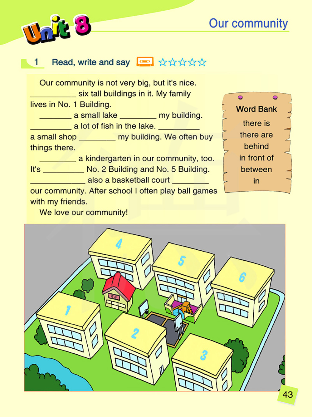 幼儿园在我们的社区里。 它在2号楼和5号楼之间。还有一个篮球场在我们社区。放学后,我经常和我的朋友们玩球类游戏。 我爱我们的社区!