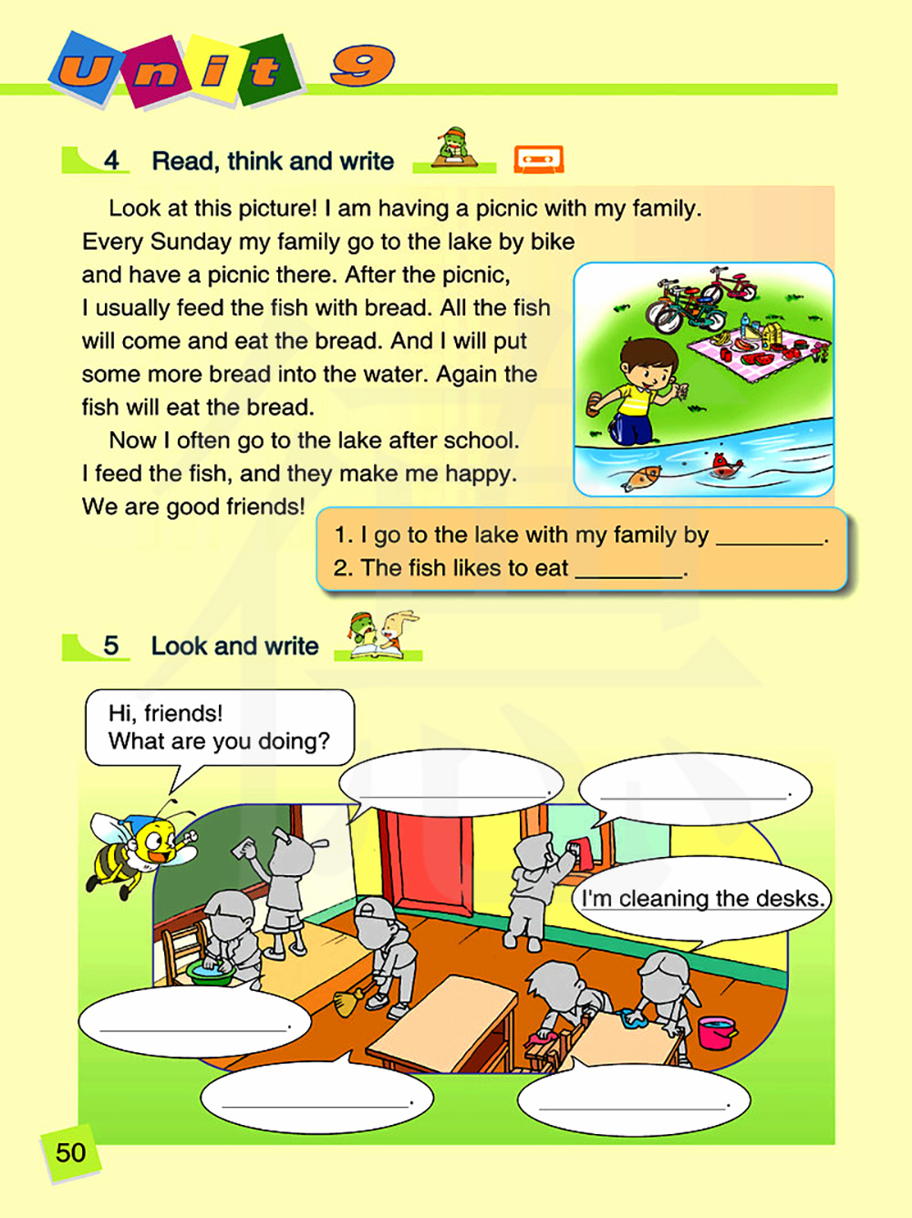 看这张照片!我和我的家人去野餐。每周日,我们一家都骑车去湖边野餐。野餐后,我通常用面包喂鱼。所有的鱼都会过来吃面包。我会把更多的面包放进水里。鱼就又会来吃面包了。