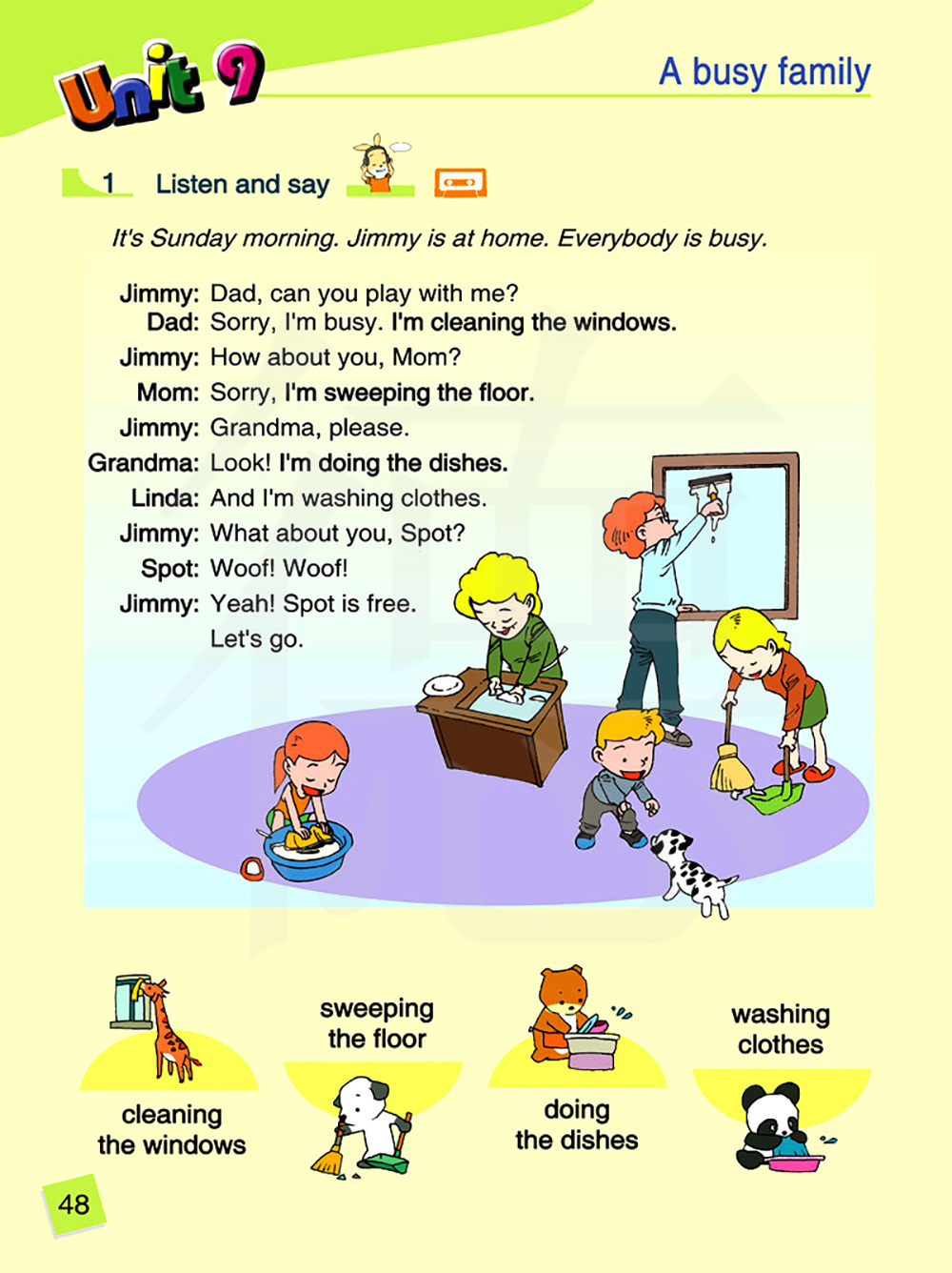 爸爸,你能和我一起玩吗?对不起,我很忙。我在擦窗户。你呢,妈妈?对不起,我在扫地。