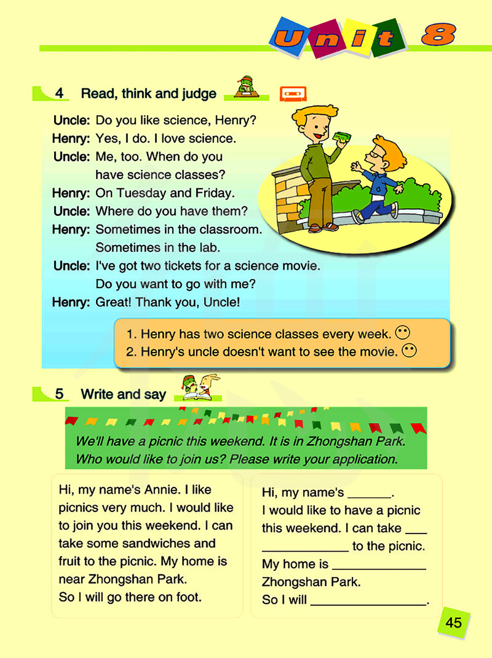 我有两张科学电影的票。你想和我一起去吗?太好了!谢谢你,叔叔!