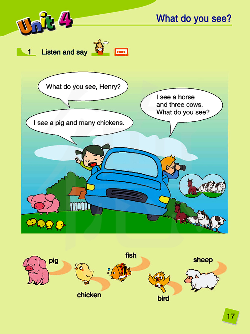 我看见一匹马和三头奶牛。你看见什么?