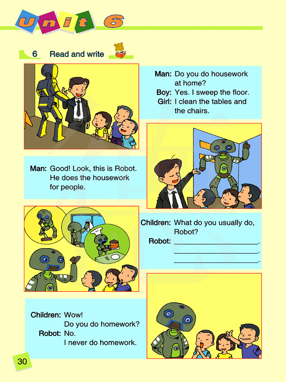 你们在家做家务活吗?做,我扫地。我擦桌子。