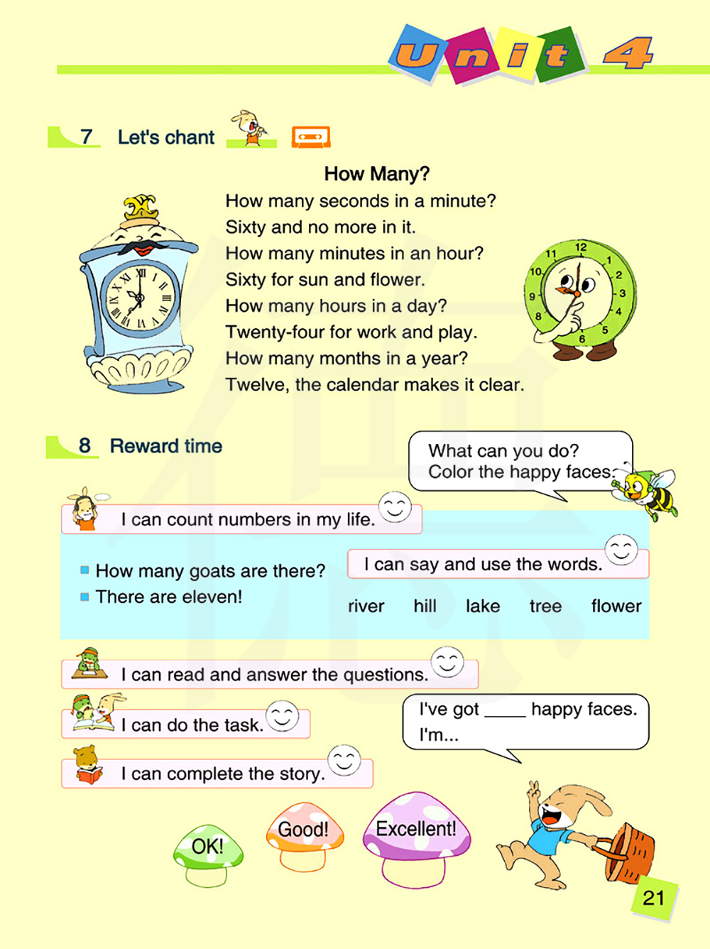 一分钟有多少秒?不多不少正好60秒。一小时有多少分钟?对太阳和花儿来说都是60分钟。一天有多少小时?对于工作和玩乐都是24小时。一年有多少个月?12个月,日历显示得清清楚楚。