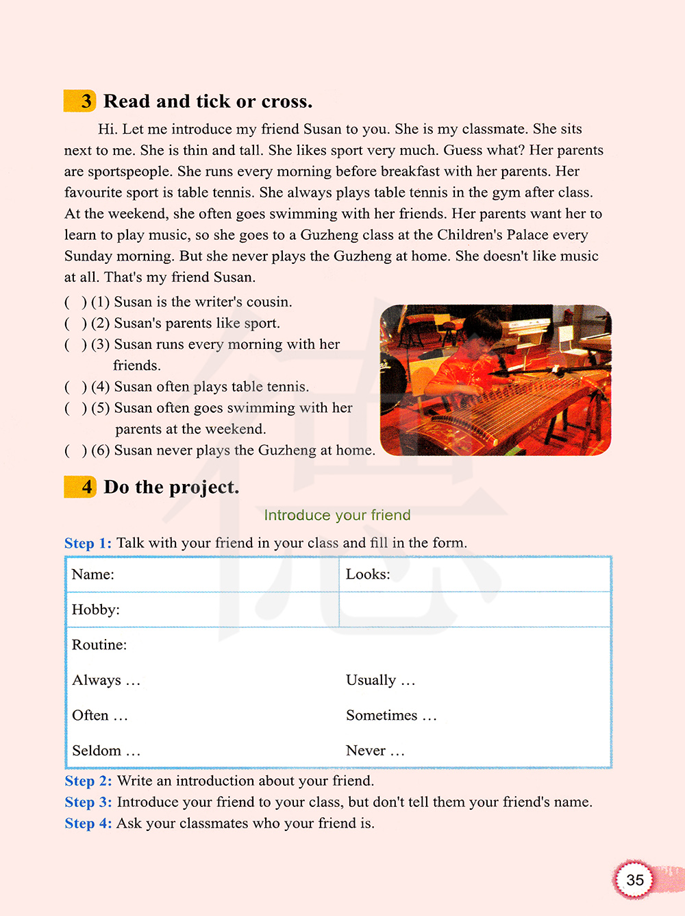 (6)苏珊从不在家里弹奏古筝。