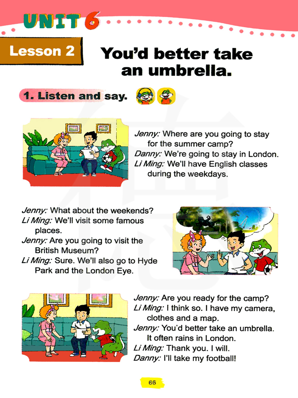 你最好带上一把雨伞.伦敦经常下雨。谢谢你我会的,我会带上我的足球。