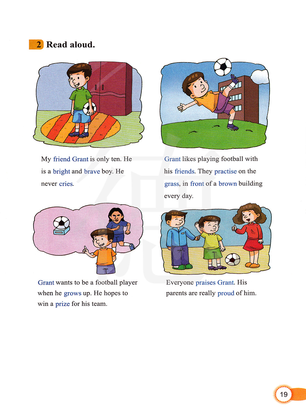 格兰特喜欢和他的朋友一起踢足球。他们每天在一座棕色大楼前的草地上练习。
