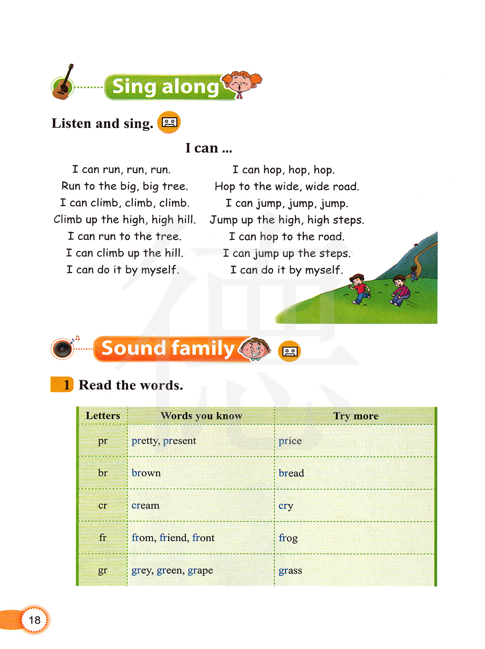 我可以跑、跑、跑。跑向那棵大大的、大大的树。我可以爬、爬、爬。 爬上那座高高的、高高的山。我可以跑向大树。 我可以爬上高山。我可以自己独立完成。我可以单脚跳、单脚跳、单脚跳。跳向宽宽的、宽宽的马路。我可以跳、跳、跳。跳过高高的,高高的台阶。 我可以单脚跳向马路。我可以跳过高高的台阶。 我可以自己独立完成。