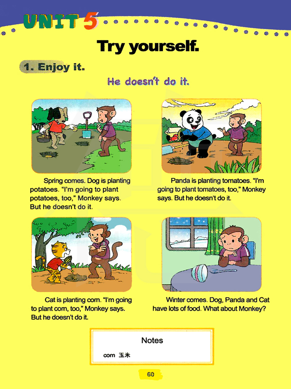小猫正在种玉米,我也打算种玉米,猴子说。但是他没做到。
