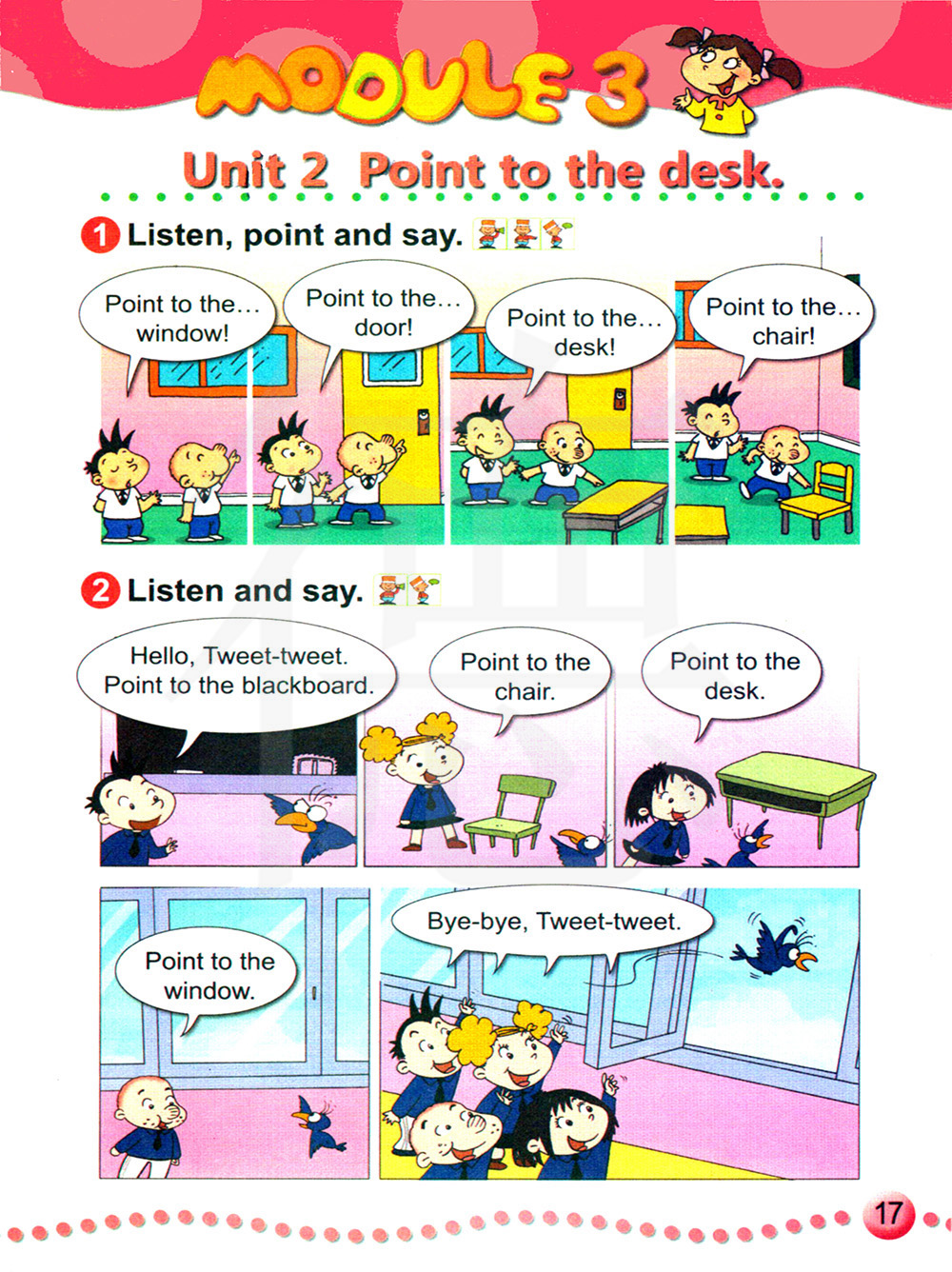 学习新单词desk,chair和复习Stand up, Sit down, 和Point to…三个指令性短语。