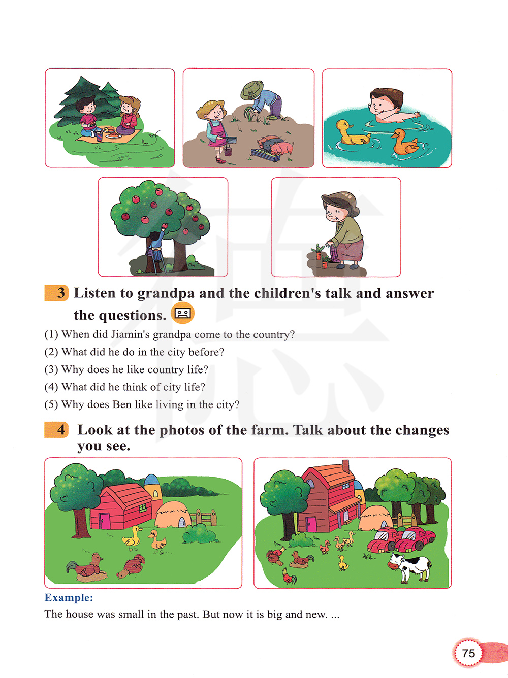 看看农场的照片。谈论你们看见的变化。