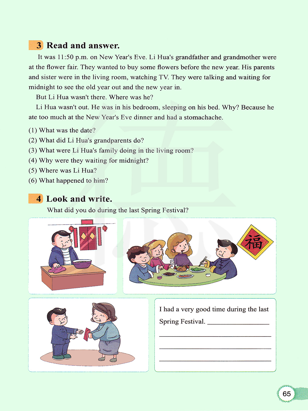 在除夕晚上11点50分。李华的爷爷奶奶在花市。他们想在新年之前买一些花。他的父母和妹妹在客厅看电视。他们在谈论并等到午夜以辞别旧岁,迎来新年。