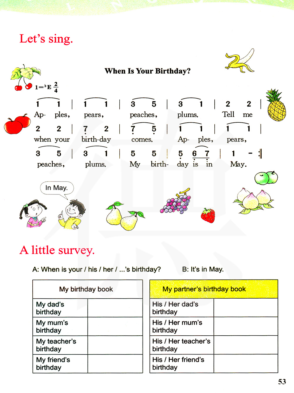 你的生日是什么时候?苹果,梨,桃子,李子。你过生日时请告诉我。苹果,梨,桃子,李子。我的生日是在五月。