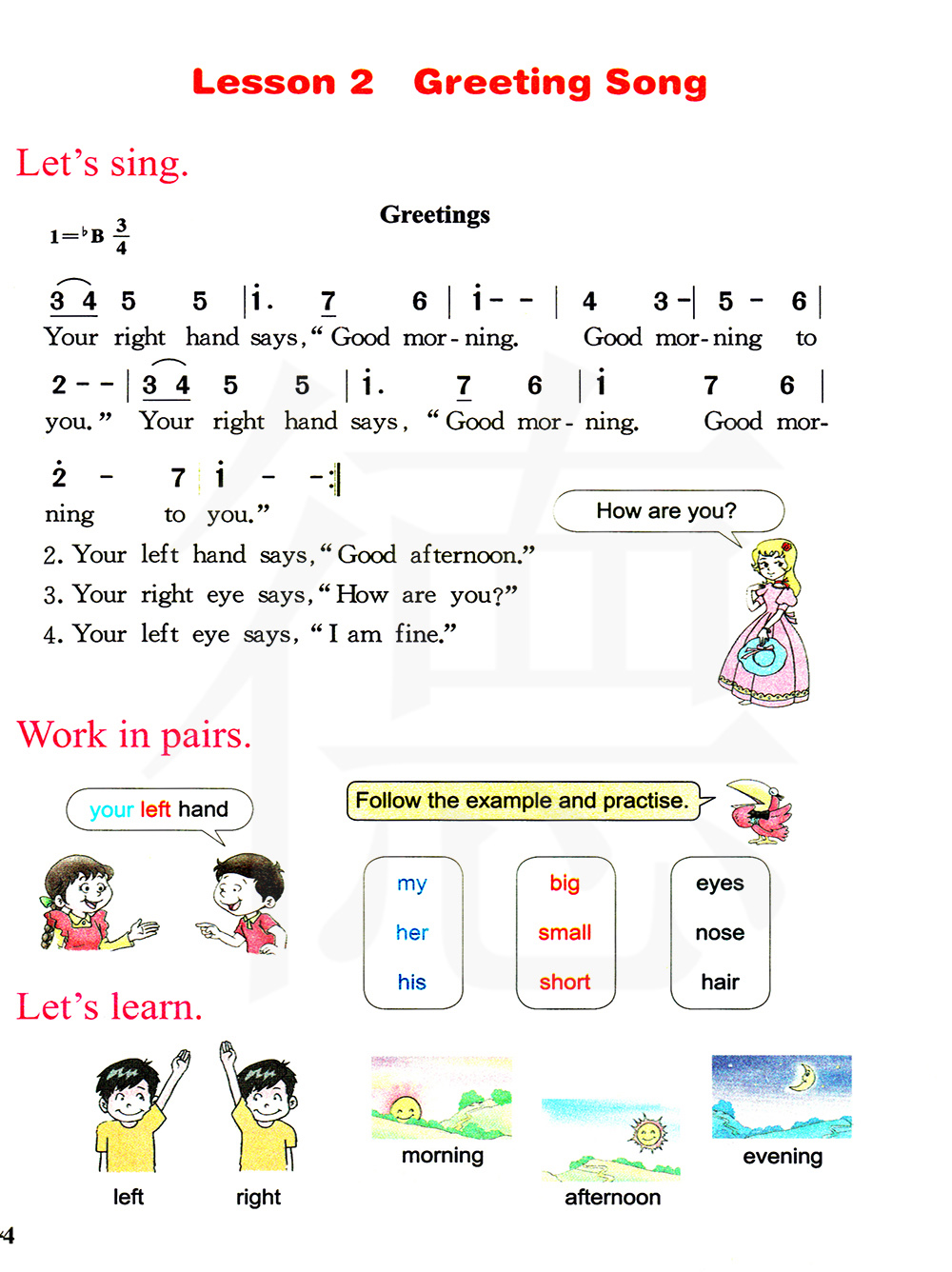 你的右手说:早上好。祝你早上好。你的右手说:早上好。祝你早上好。你的左手说:下午好。祝你下午好。你的左手说:下午好,祝你下午好。你的右眼说:你好吗?你好吗?你的右眼说:你好吗?你好吗?