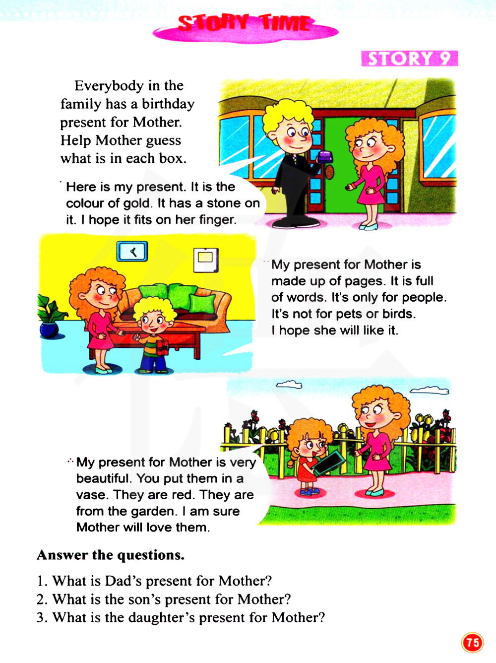 这个家庭里的每个成员都送了妈妈一个生日礼物。来帮妈妈猜猜每个盒子里是什么礼物吧。
