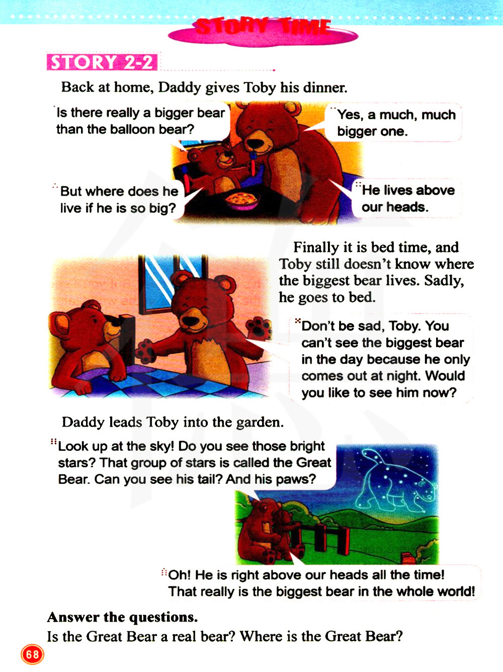 最后到了睡觉时间,托比仍然不知道最大的熊住在哪里。她伤心地睡觉了。
