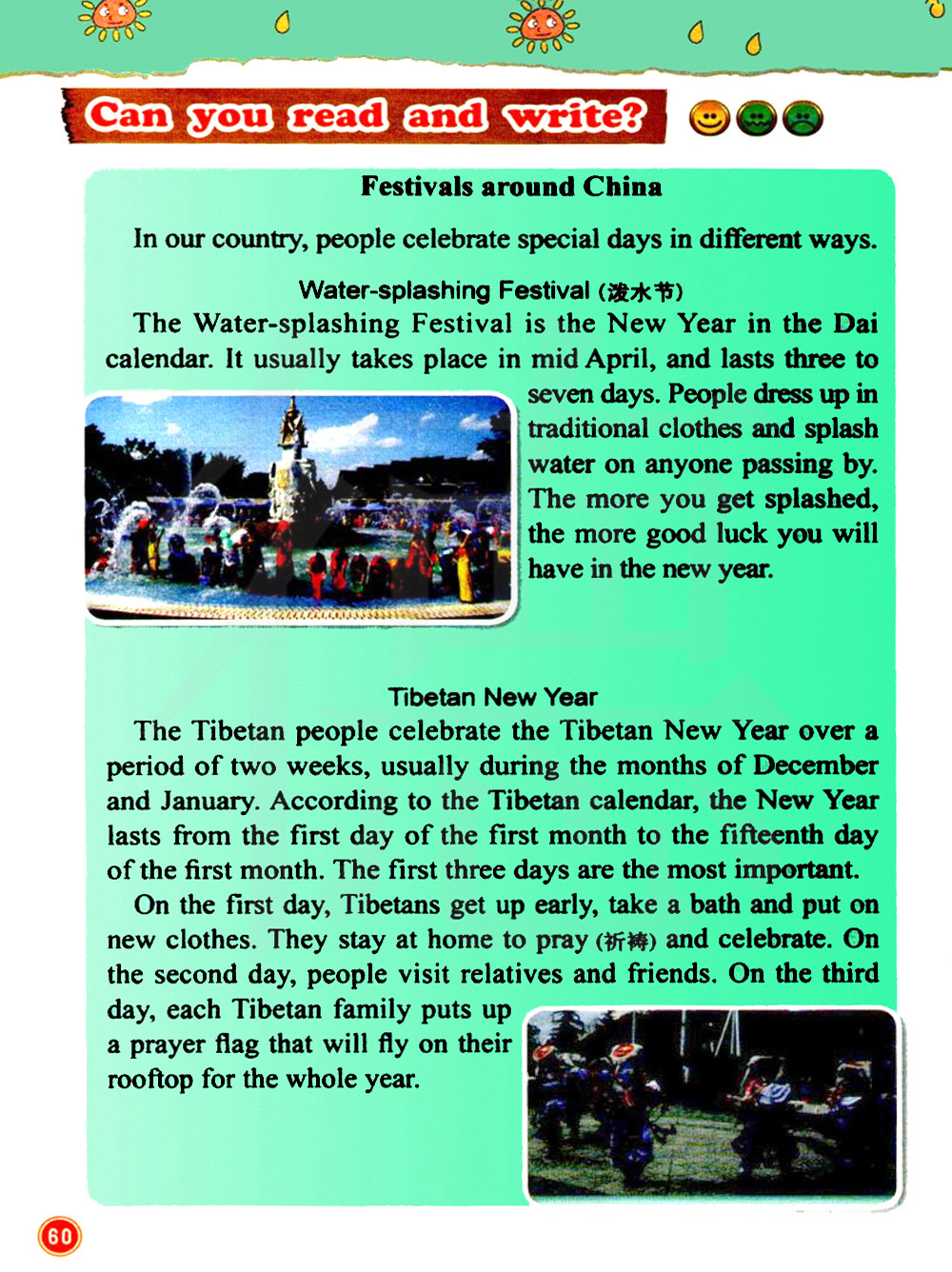 泼水节。泼水节是傣历新年。它通常在四月中旬举行,并持续三到七天。人们穿上传统服装往每个经过的人身上泼水。你被泼的水越多,你在新的一年好运就会越多