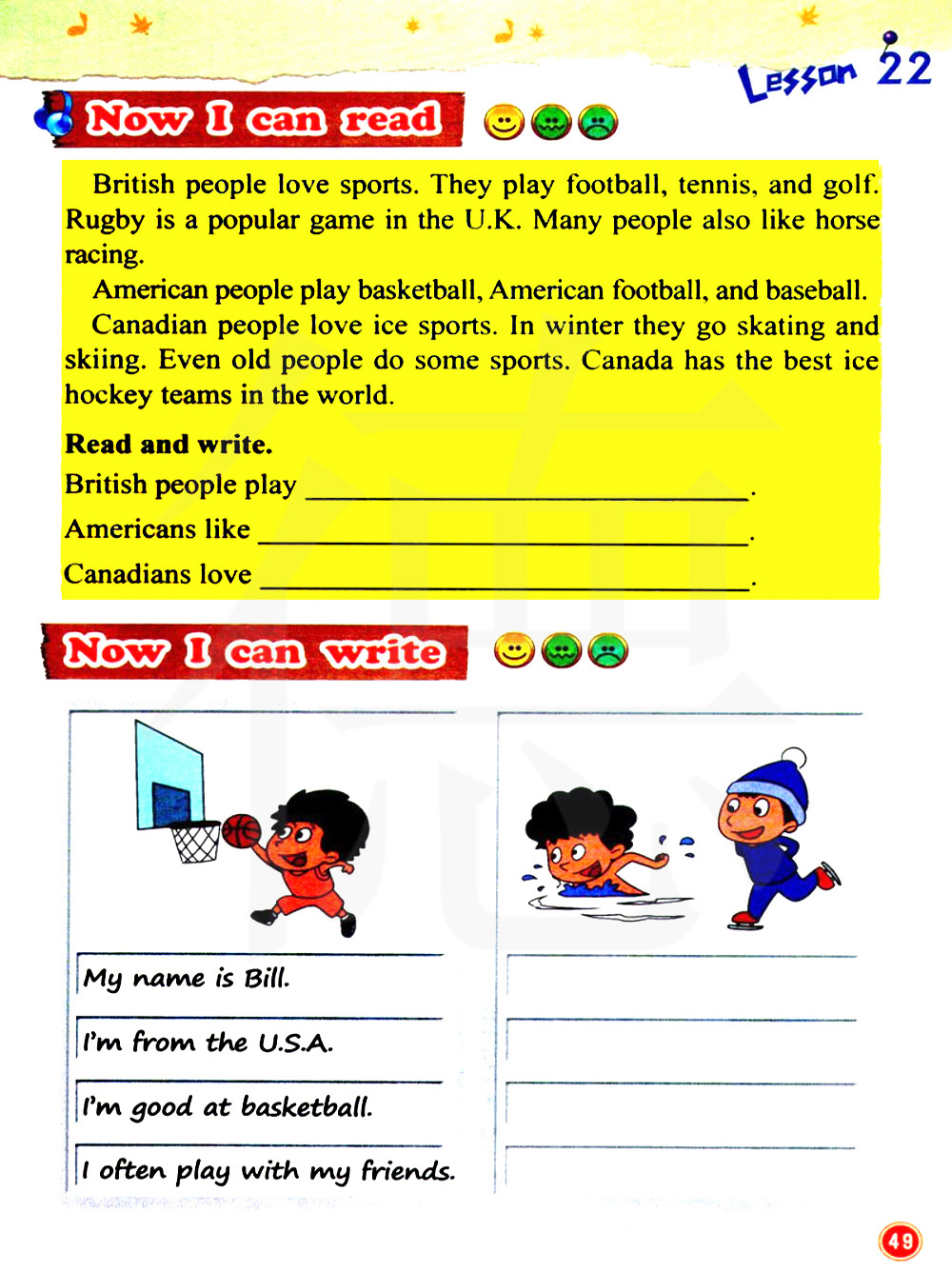 英国人热爱运动。我们踢足球、打网球和高尔夫球。在英国橄榄球是一项很流行的运动项目。很多人也喜欢赛马。美国人喜欢打篮球、美式足球和棒球。加拿大人热爱冰上运动。 冬天他们去溜冰和滑雪。甚至老年人也做一些运动。加拿大有世界上最好的冰球球队。