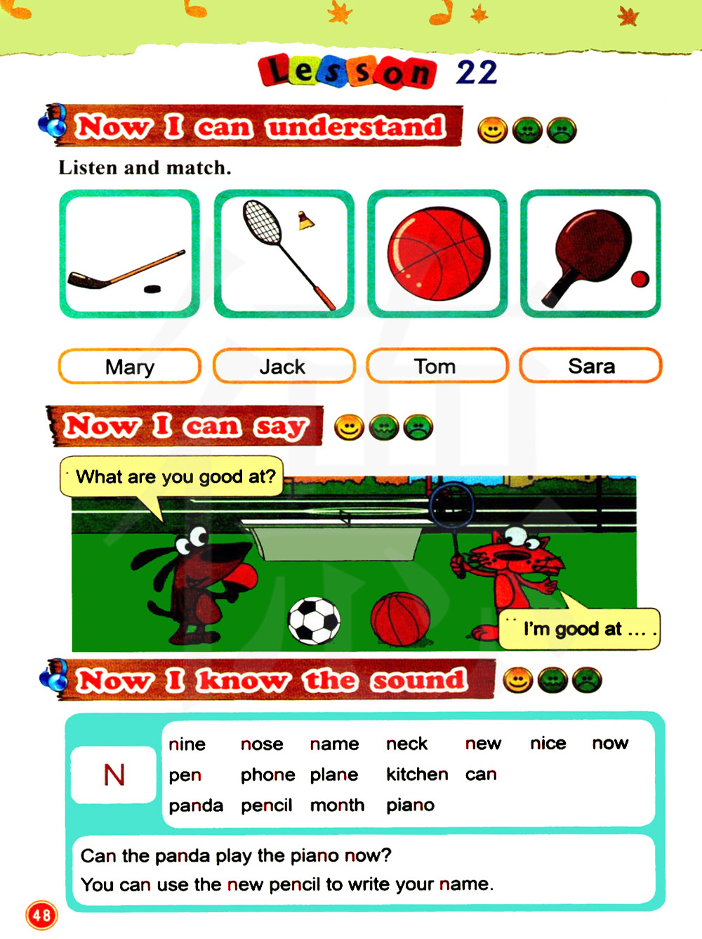 九 鼻子 名字 脖子 新的 友好的 现在 钢笔 电话,飞机 厨房 能;会 熊猫 铅笔 月份 钢琴