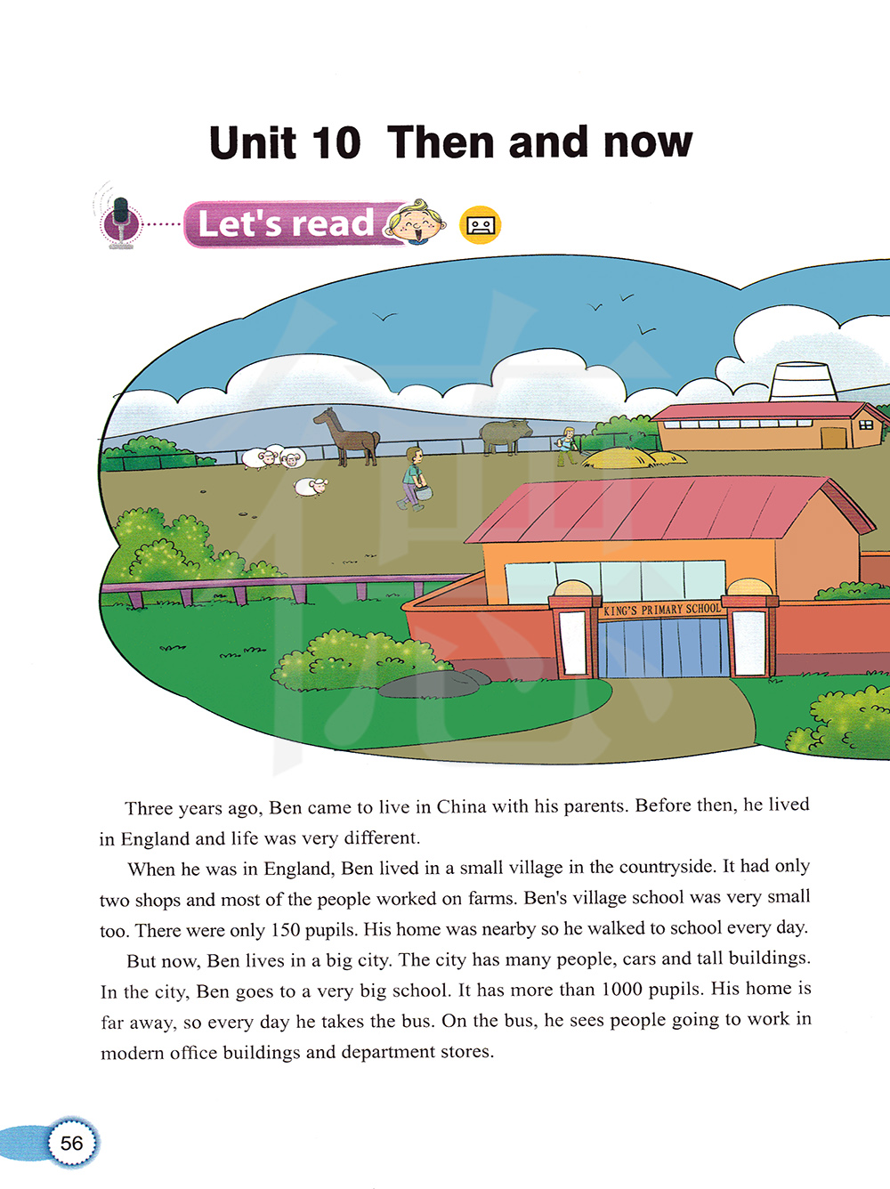 但是现在,本住在大城市里了。这个城市有很多的人、汽车和高大的建筑物。 5608 5608a w 350 In the city, Ben goes to a very big school. It has more than 1000 pupils. 在城市里,本去一个很大的学校上学。学校里有1000多名学生。 5609 5609a w 350 His home is far away, so e
