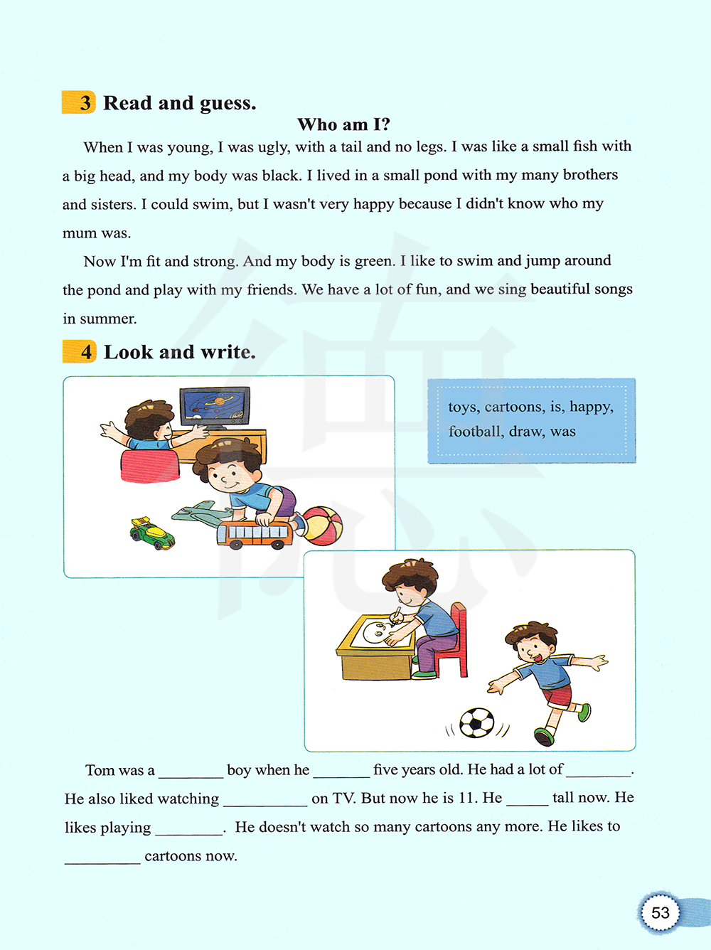 我年轻的时候,我长的很丑,我有一条尾巴,没有腿。我像一条小鱼,有一个大的头,身体是黑色的。 我和我的很多兄弟姐妹住在一个小池塘里。我会游泳,但是我们不开心,因为我不知道我的妈妈是谁。