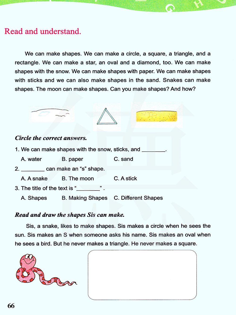 Sis,一条蛇,喜欢做形状,Sis当他看到太阳时,他就围成一圈,Sis当有人问起他的名字时,做一个S形,Sis当他看见一只鸟时,就做一个椭圆形的,但他从不做一个三角形,他从不做一个正方形,Sis当他看见一只鸟,做一个椭圆,但他永远不会使一个三角形,他从来不做一个正方形。