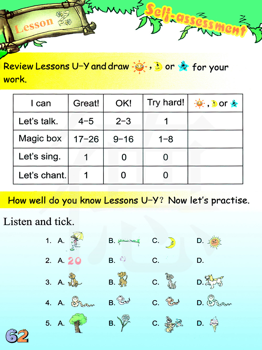 复习第U课至第Y课,并为你的学习情况画上太阳、月亮或者星星