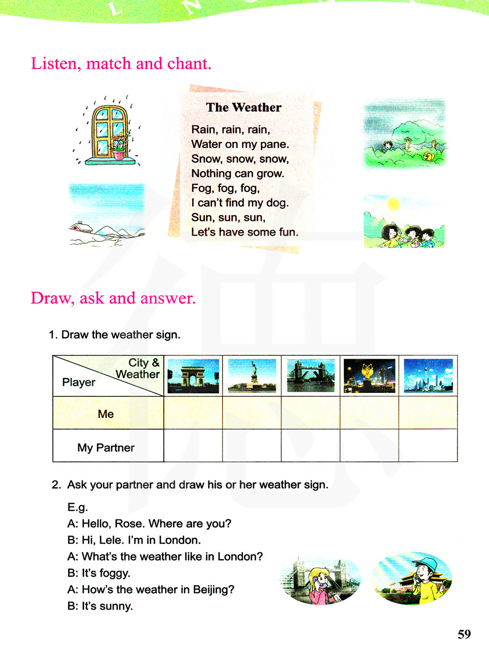 雨,雨,雨,水在我的窗上,雪,雪,雪,没有什么能生长,雾,雾,雾。太阳太阳,让我们有一些乐趣。