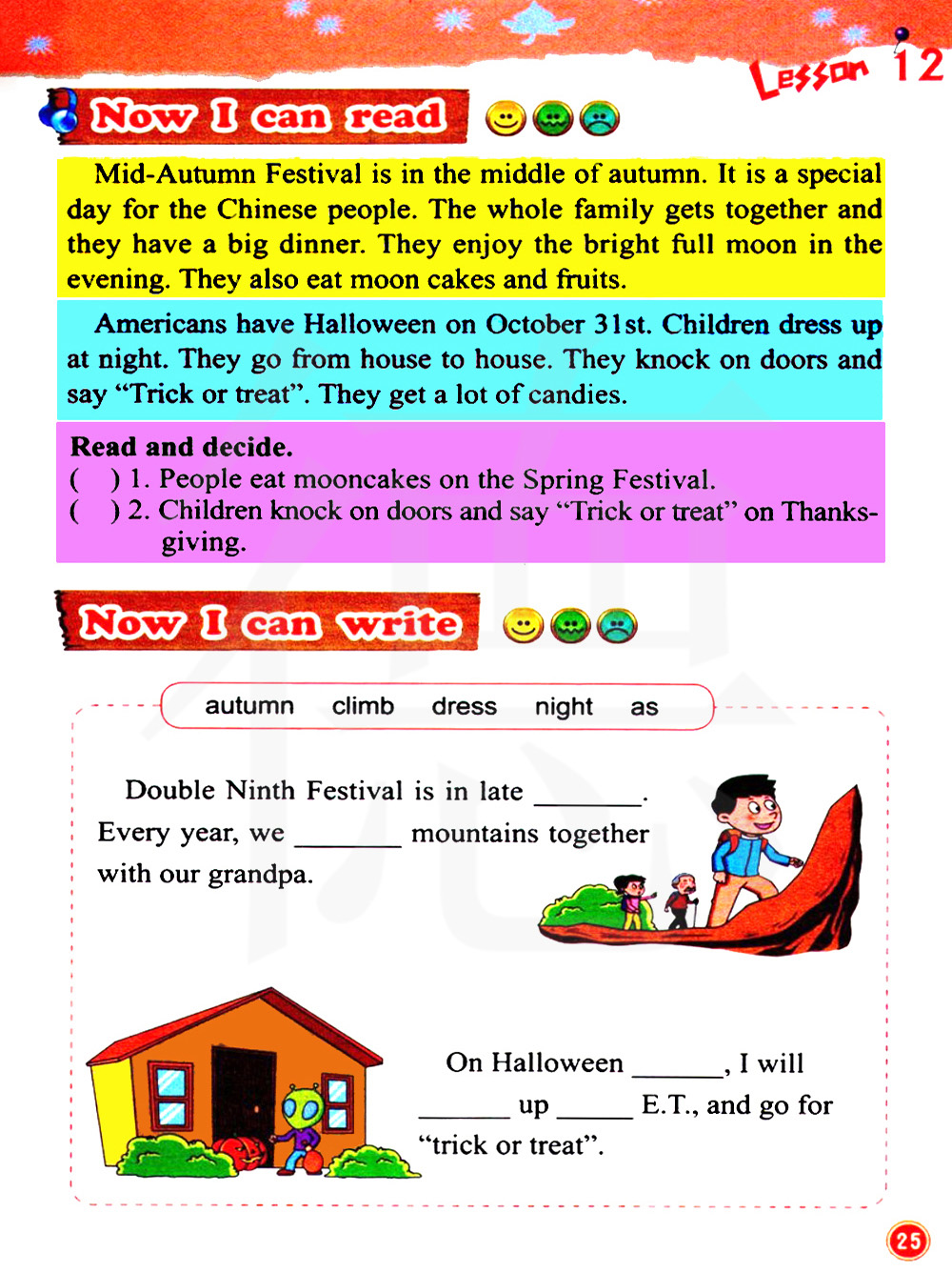 美国人在 10 月 31 日过万圣节。 孩子们在晚上打扮。他们挨家挨户敲门,并说不给糖就捣蛋。他们得到很多糖果。