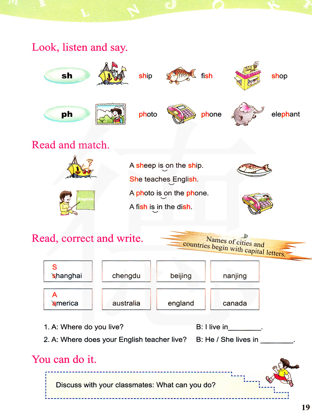 一只绵羊在船上 她教英语 一张照片在电话上面 一条鱼在盘子里面