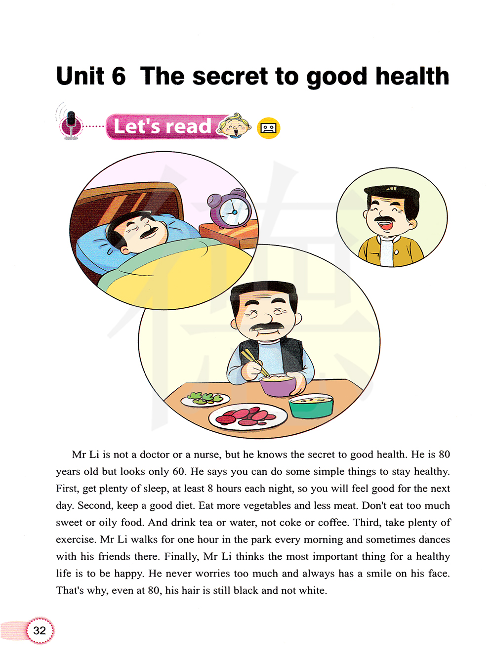 李先生既不是医生也不是护士,但是他知道身体健康的秘诀。他80岁了,但是看起来只有60岁。他说他能做一些简单的保持健康的事情。首先,拥有充足的睡眠,至少每天晚上8个小时,这样你第二天就会感觉很好。第二,保持一个良好的饮食习惯。多吃蔬菜,少吃肉。 不要吃太多的甜食或油腻的食物。并且喝茶或水,不要喝可乐或咖啡。 第三,做大量的运动。李先生每天早上在公园步行一小时,有时和他的朋友在那跳舞。最后,李先生认为