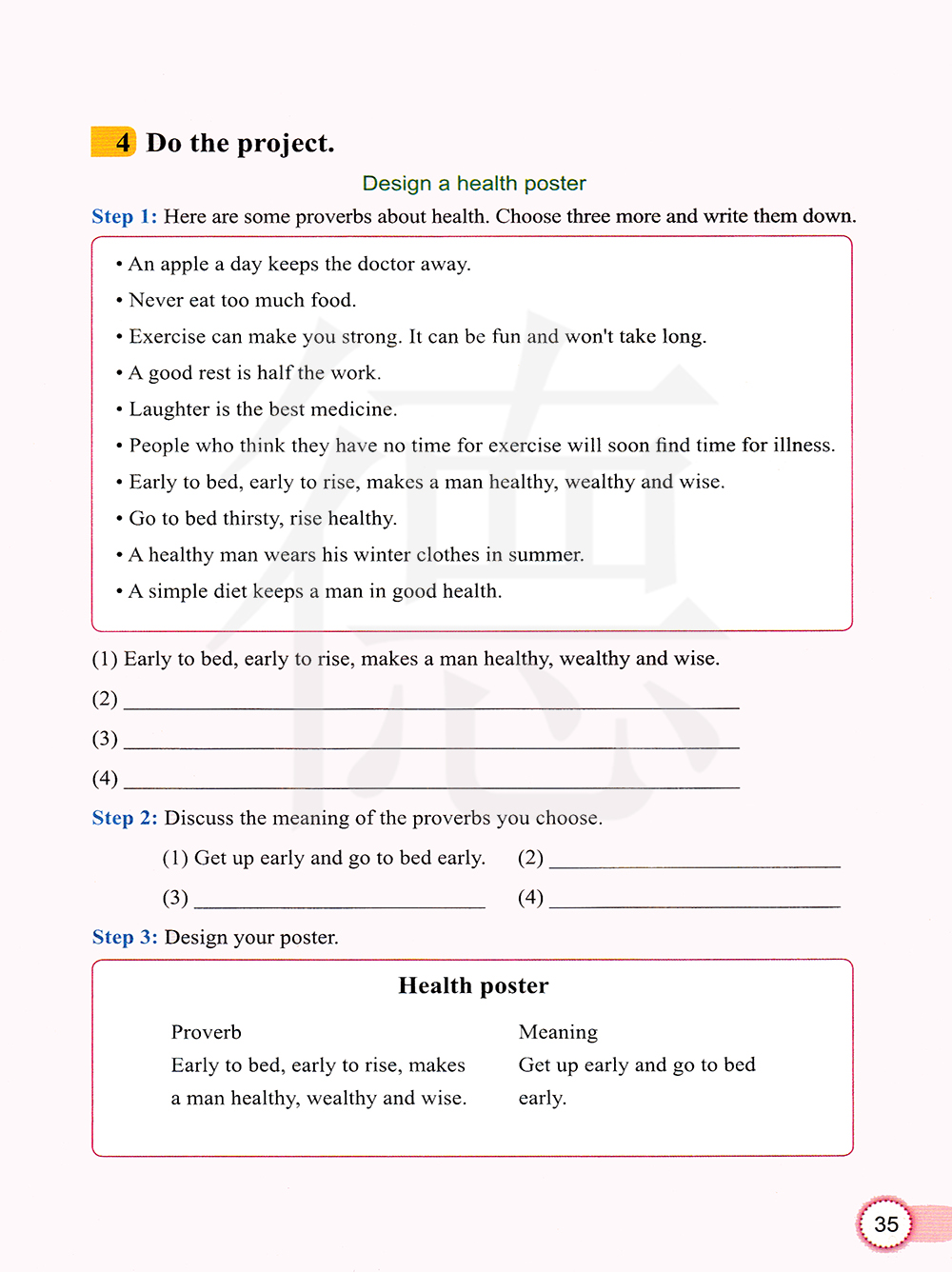 步骤一:这里有一些关于健康的谚语。选择三个并把它们写下来。