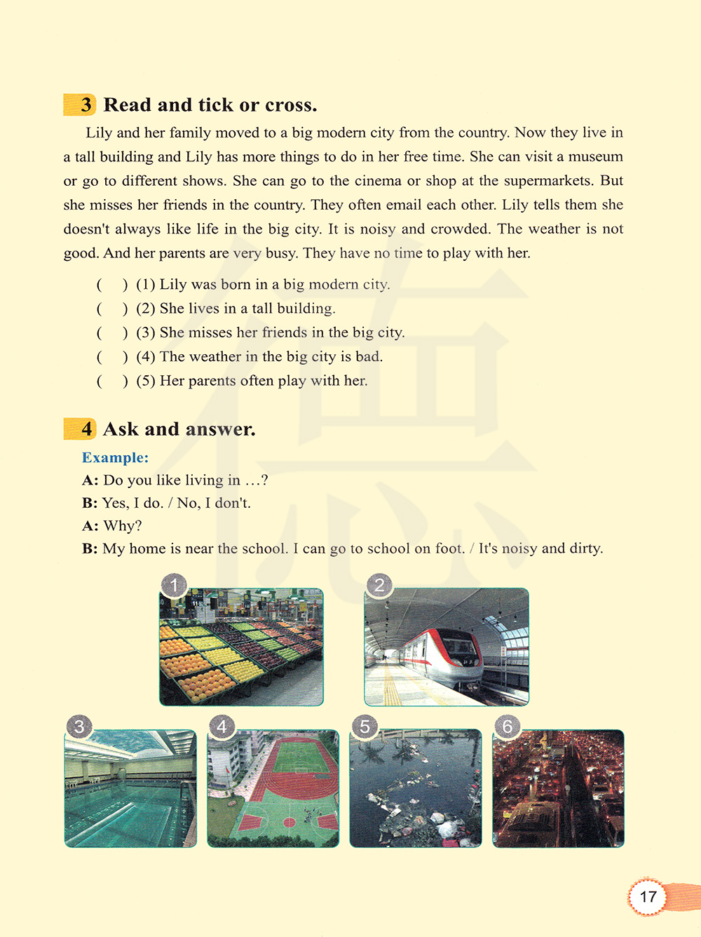 莉莉和她的家人从乡村搬去了一个大的现代化的城市。现在他们住在一栋高大的建筑物里面,并且莉莉在空余时间有更多的事情可以做。她可以参观博物馆或去观看不同的表演。她可以去看电影或在超市购物。 但是她想念她在乡村的朋友。他们经常互相发送电子邮件。莉莉告诉他们她总是不喜欢大城市的生活。它又嘈杂又拥挤。