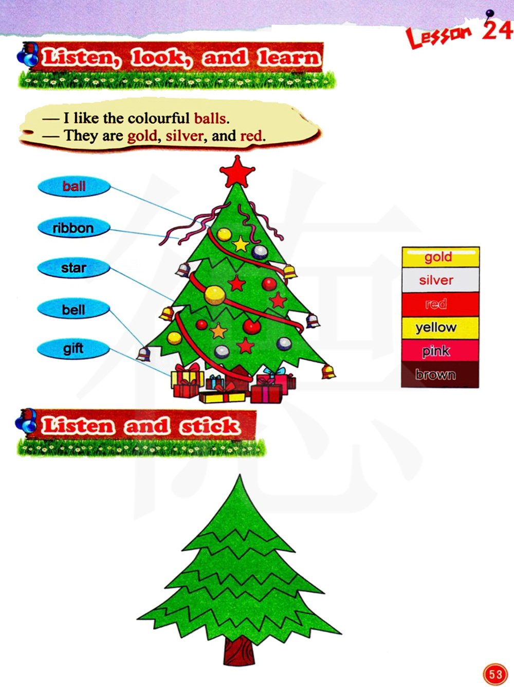 我喜欢彩球.它们有金色的,银色的和红色的。