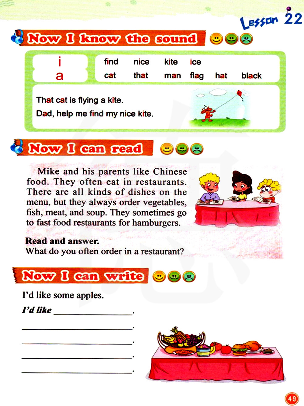迈克和他的父母喜欢中餐。他们经常在餐馆吃饭。菜单上有很多种菜品,但是他们总是点蔬菜、鱼、肉和汤。他们有时候去快餐店吃汉堡。