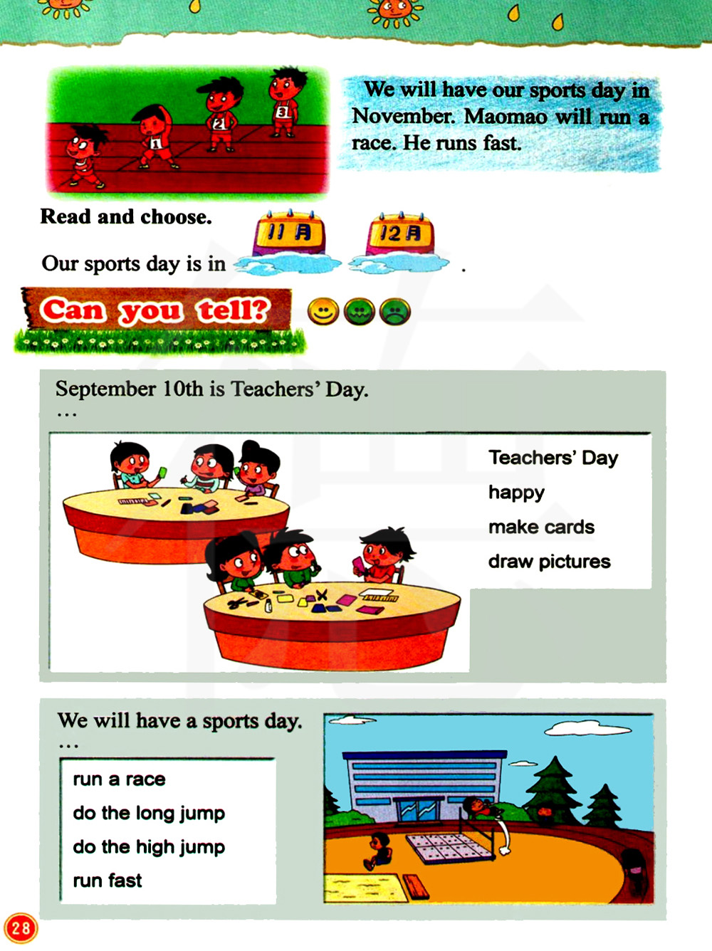我们将在十一月举行运动会,毛毛会参加赛跑,他跑得很快。