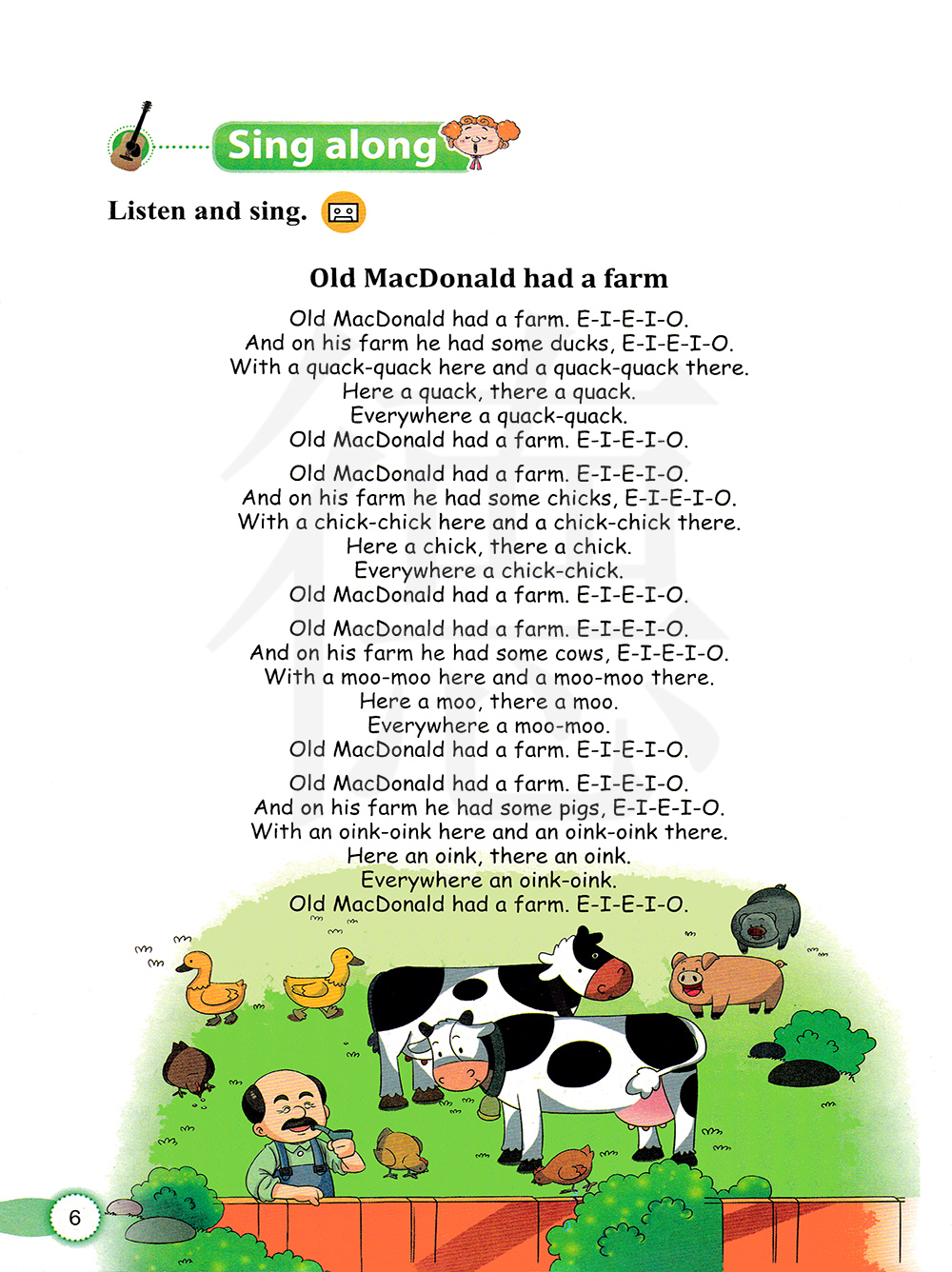 老麦克唐纳有一个农场。咿呀咿呀噢。他的农场里有一些鸭子,咿呀咿呀噢。在这里嘎嘎叫,在那里也嘎嘎叫。这里嘎一声,那里嘎一声。到处嘎嘎叫。老麦克唐纳有一个农场。咿呀咿呀噢。老麦克唐纳有一个农场。咿呀咿呀噢。他的农场里有一些小鸡,咿呀咿呀噢。在这里咯咯叫,在那里也咯咯叫。 这里咯一声,那里也咯一声。 到处咯咯叫。老麦克唐纳有一个农场。咿呀咿呀噢。 老麦克唐纳有一个农场。咿呀咿呀噢。 他的农场里有一些奶牛