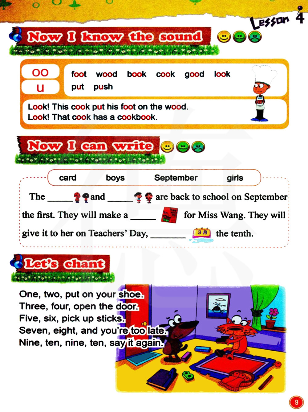 看!这个厨师把他的脚放到木头上.看!那个厨师有一本食谱。