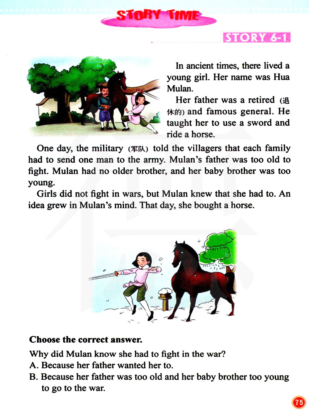 战争中是没有女孩去打仗的,但是木兰知道她得去。 木兰的心中生出一个主意。那天,她买了一匹马。