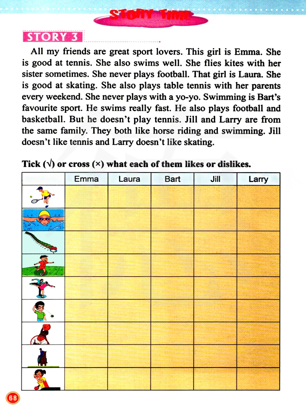 我所有的朋友都是很棒的体育爱好者。这个女孩是艾玛。她很擅长打网球。 她游泳也游得很好。有时候,她和她姐姐去放风筝。她从来不踢足球。那个女孩是劳拉。她擅长滑冰。 她每个周末还和父母去打乒乓球。 她从不玩儿溜溜球。游泳是巴特最喜欢的运动。。他游得真快。他还踢足球和打篮球。但是他不打网球。吉尔和拉里来自同一个家庭。他们都喜欢骑马和游泳。 吉尔不喜欢网球,而拉里不喜欢滑冰。